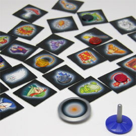 コマを回転させたままコマの上の部分をはずし、現れた図柄と同じタイルの上に、いち早く自分の色のチップを置きます。