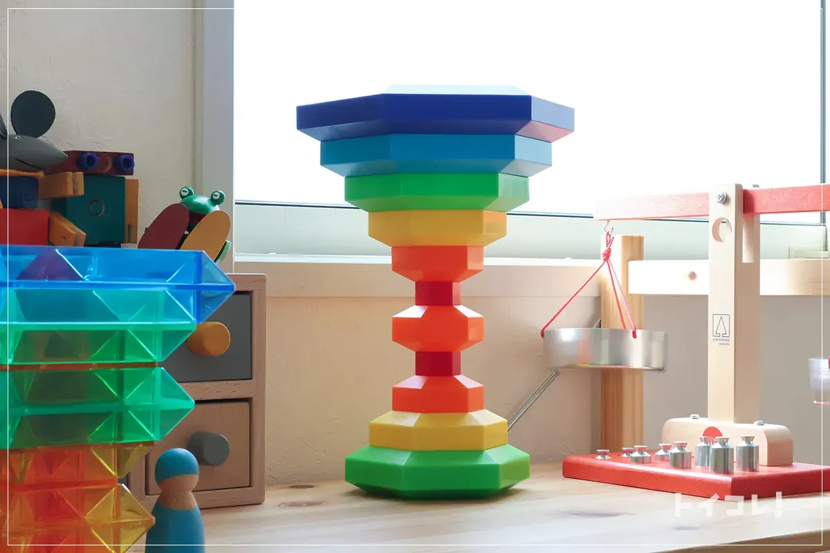 我が家は上の子がいるので、少し大きい子向けの知育ブロック「プレイ・スティックスシリーズ」や「ピエロのびっくりはかり」をレンタルしてみました♪